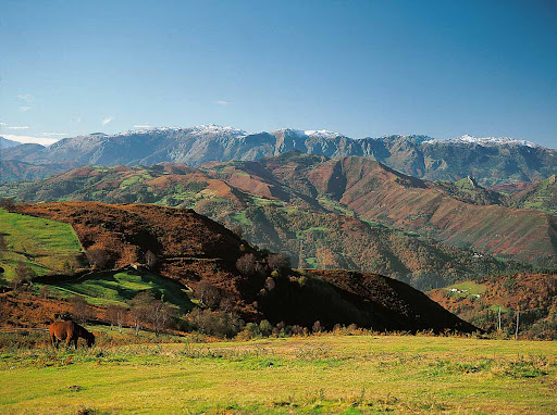 Siguiendo la senda que la propia naturaleza ha marcado y el hombre a pronunciado, nos encontramos sin duda un lugar compuesto por tierra y agua, lugar de medio natural que por sus valores estéticos, culturales y paisajísticos sean merecedores de una protección especial, nos encontramos frente a la Sierra de Aramos en pleno corazón del Principado de Asturias. Formada y rodeada por valles de una hermosura única difícil de expresar, con formaciones rocosas que se extienden hasta rozar la suela de nuestros zapatos. Una región donde la fauna común son los lobos, liebres, armiños, jabalís y corzos conviven en el mismo medio aunque no siempre en buena armonía. La configuración calcárea es perfilada sutilmente por el relieve contrastado del fino contorno de los cordales y valles que lo circundan. Los ríos que discurren por sus laderas son el Riosa y el Morcin, sus aguas se deslizan por las pendientes formando numerosas varillas cerradas, cuevas y ollas también llamadas Toyos. Podemos observar durante todo el año abundantes majadas de verdes praderas donde pasta el ganado. Las laderas nos regalan a la vista acebos, hayas, robles y castaños. Hemos de decir que en éste lugar nos encontramos en plena armonía con la naturaleza, donde el hombre aun no ha osado en marchitarlo. En la Sierra Aramo podemos optar por dos tipos de ruta. La primera la ruta Viapará-Angliru destacando que desde su cima podemos contemplar unas impresionantes vistas de casi todo el Principado de Asturias e incluso en días claros podemos observar el Mar Cantábrico, Picos de Europa…etc. La segunda ruta es la llamada Mullieros-Curva Llagos, que discurre através del monte y las grandes praderas que lo rodean. Un cordal calizo que nos puede dejar deslumbrados por su belleza natural.